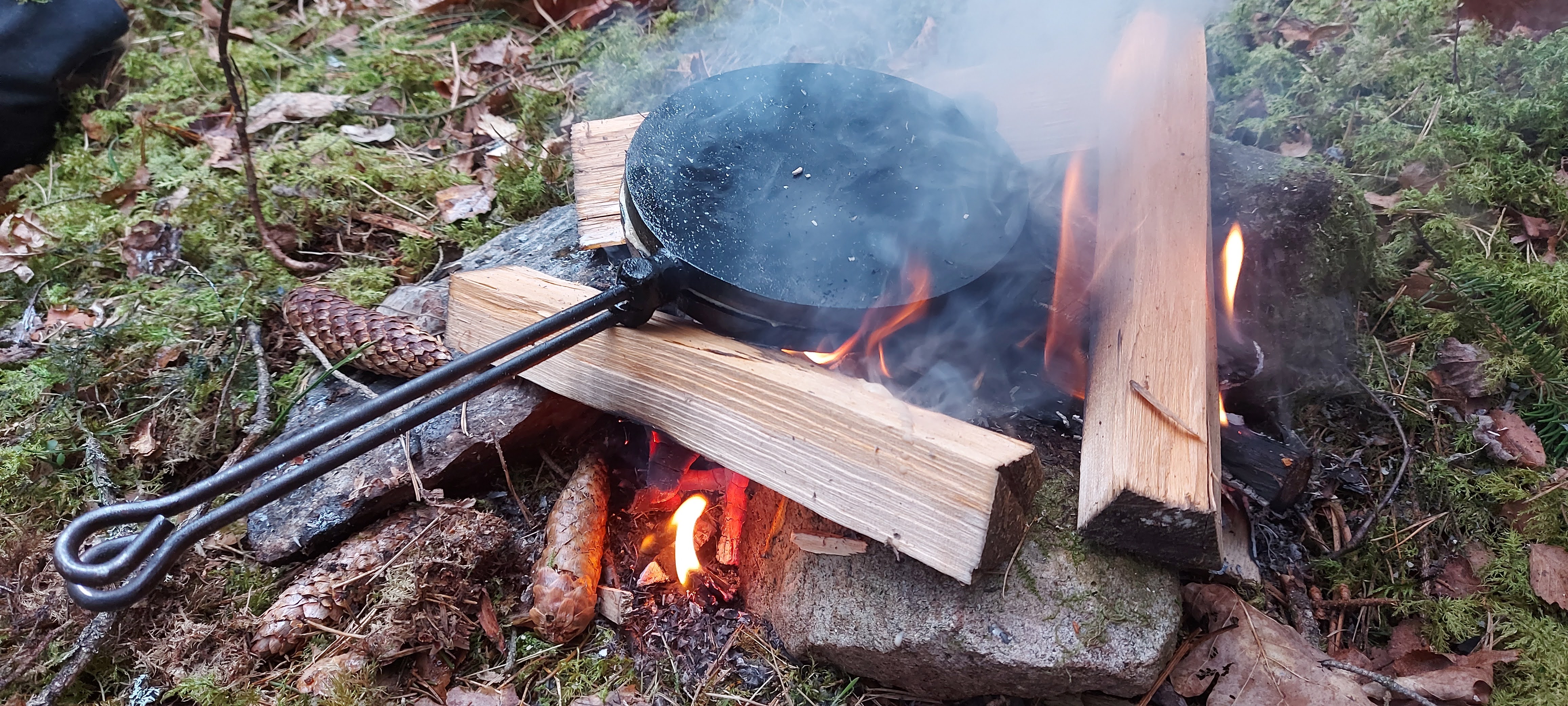 Efter en stunds paddling och närvaroövningar stannar vi vid stranden där brasan väntar. Vi njuter av värmen från brasan, varm dryck och gemenskap runt elden.
